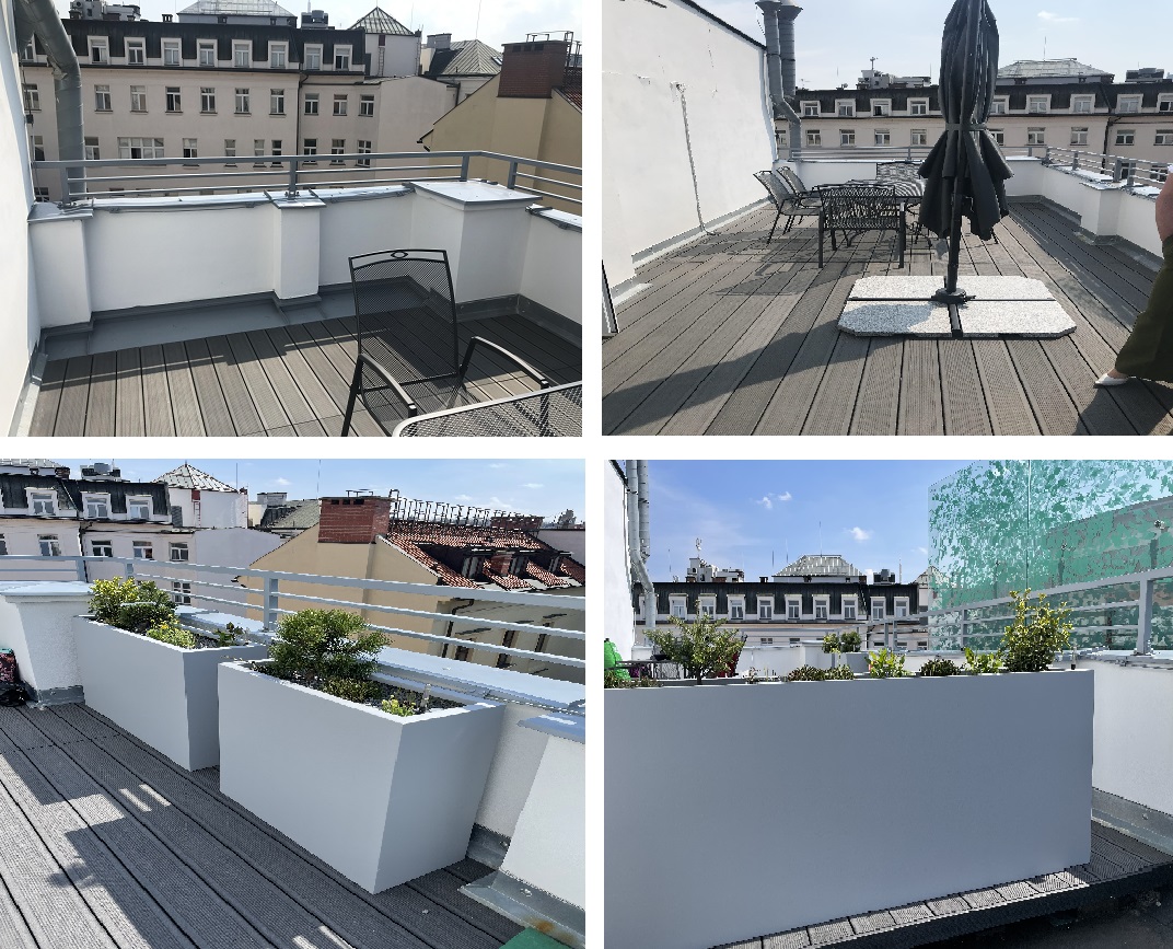 Der Hauptsitz von Lasvit ist ein einzigartiges Projekt, das als Gebäude des Jahres 2020 ausgezeichnet wurde. Zum Gebäude gehört auch eine Außenterrasse, die den Mitarbeitern als Erholungsraum dient. Die Terrasse ist mit Pflanzkästen in einem zurückhaltenden Anthrazit Farbton ausgestattet, die sowohl mit Laub- als auch Nadelbäumen bepflanzt worden sind. Die Komplexität des architektonischen Entwurfs, der insgesamt sehr präzise und minimalistisch ist, zeigt sich in der Konzeption der Pflanzkübel im Innenbereich. Diese sind ausschließlich in Weiß ausgeführt und bei ihnen wiederholt sich die Form von Zylindern sowie strengen eckigen Formen. Einfachheit, klare Linien, Natürlichkeit - 3 Worte, die das gesamte Projekt vereinen.