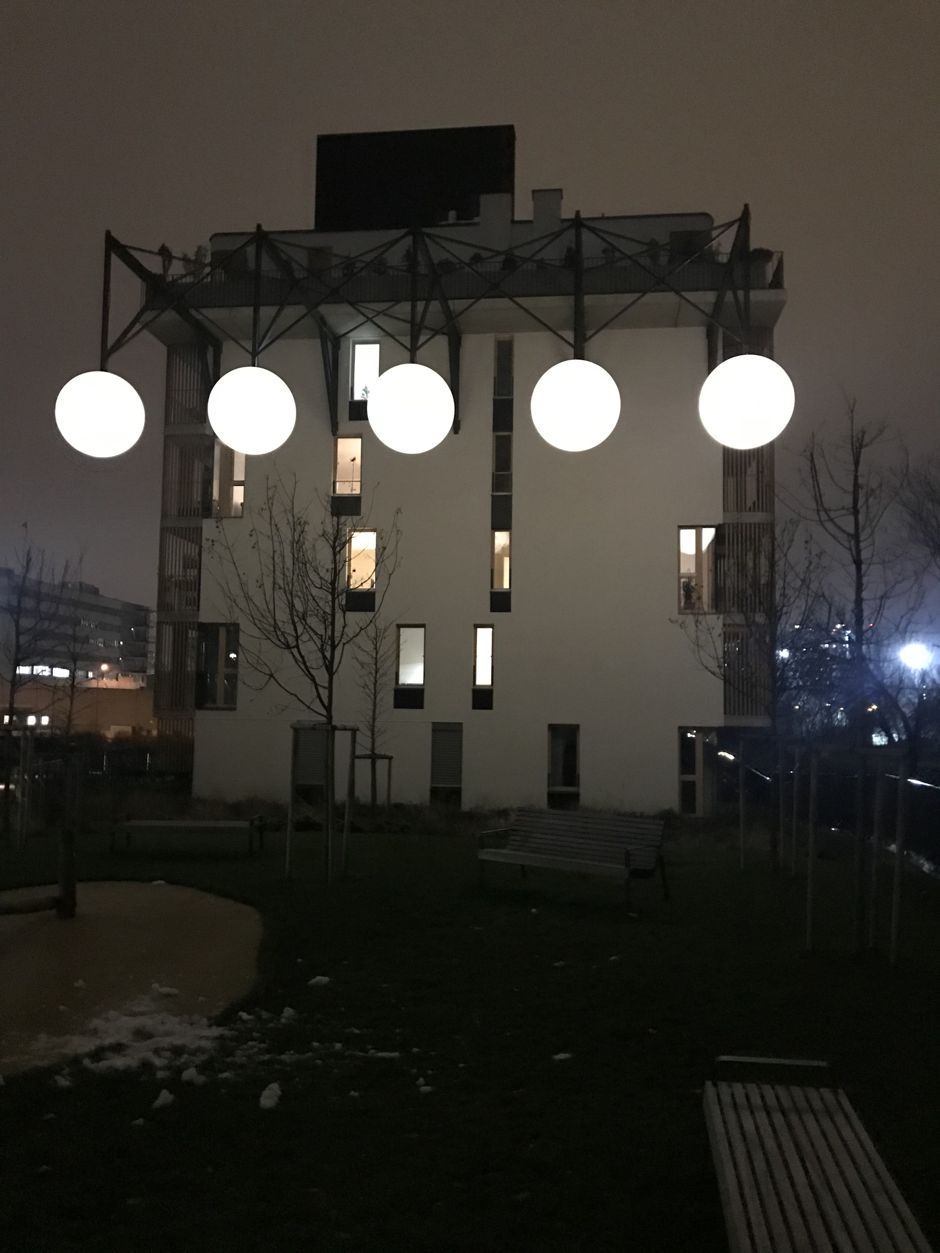Im Laufe des Projektes haben sich nach Absprache mit dem Investor unsere Aufgaben erweitert. Es handelte sich um 5 Lichtkugeln aus Fiberglas mit einem Durchmesser von 2 m, deren Lichtstärke je nach Tages- und Nachtzeit automatisch reguliert wird. Die Fiberglas-Objekte sind auf einer vorbereiteten Stahlkonstruktion befestigt und ihre erfolgreiche Installation war nur durch das perfekte Zusammenspiel mehrerer Gewerke möglich. Es ist sehr interessant, zunächst die Visualisierung eines Objektes zu sehen und dann die Bilder mit der Realität zu vergleichen. Es handelt sich in diesem Fall um fast identische Ansichten, und die Vorstellung der Architekten wurde bis ins letzte Detail erfüllt.