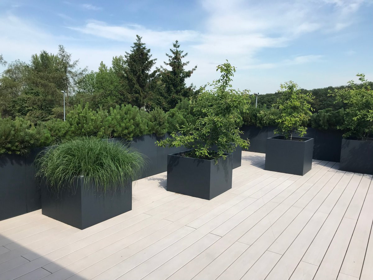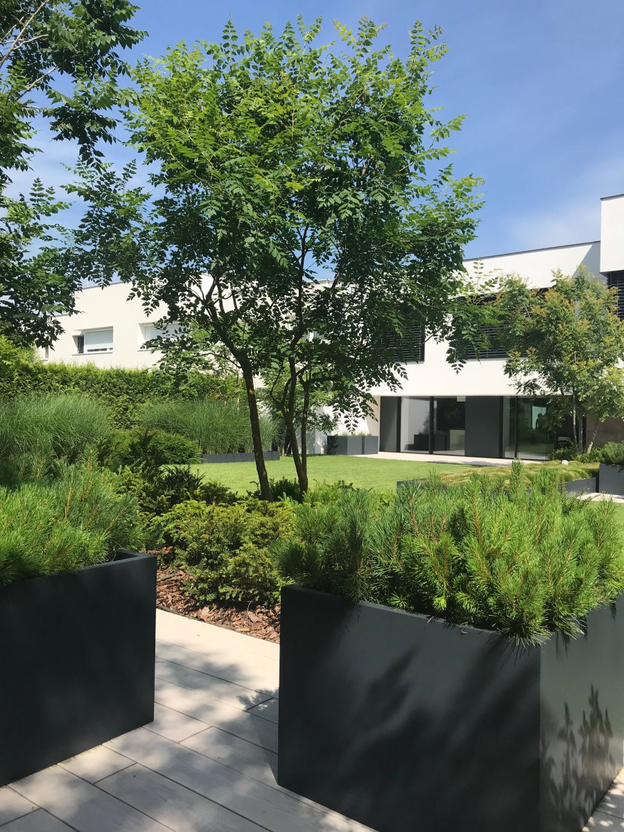 Die minimalistischen Pflanzgefäße fügen sich nahtlos in die Funktion des Gartens ein, der mit dem Wohnbereich des Hauses verbunden ist. Einige der quadratischen Pflanzgefäße befinden sich auch auf der Außenterrasse im ersten Stock des Hauses. Während die Gartenvegetation natürlich wächst, fügen sich die Fiberglas-Pflanzgefäße in ihre Umgebung ein und werden zu einem integralen Bestandteil des Außenbereichs.